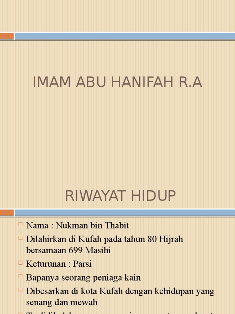 Imam Abu Hanifah R A Imam Abu Hanifah R A Riwayat Hidup Nama Nukman Bin Thabit Kelahiran 80h 699 M Di Kufah Gelaran Abu Hanifah Kerana Anaknya Bernama Ppt Download