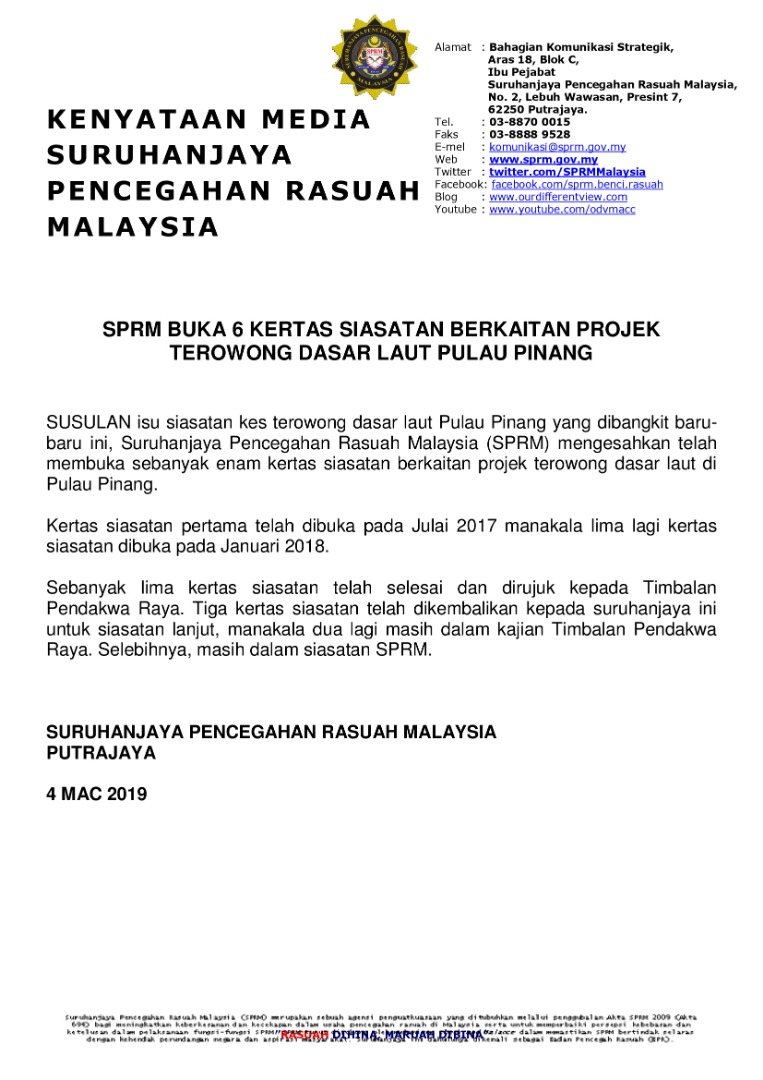 Sprm Buka 6 Kertas Siasatan Berkaitan Projek Terowong Dasar Laut Pulau Pinang
