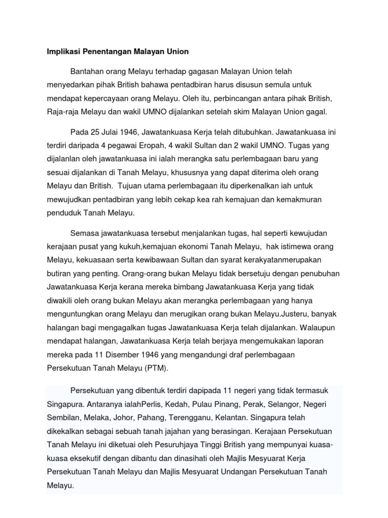 Kesan Penubuhan Malayan Union Pengajian Am
