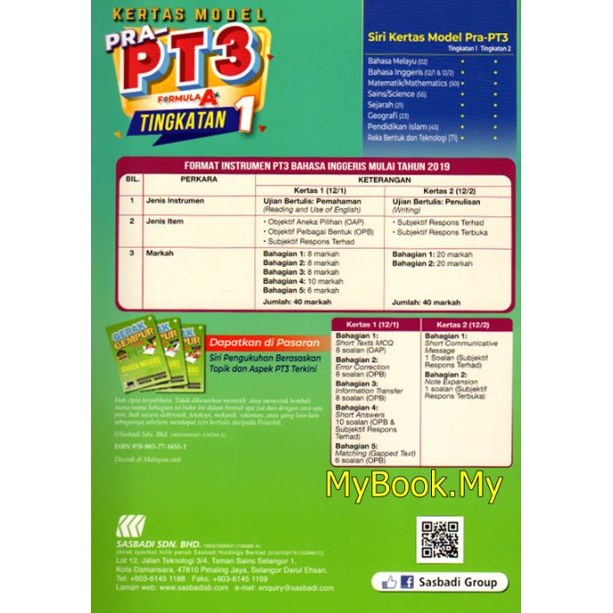 Myb Buku Latihan Kertas Model Pra Pt3 Tingkatan 1 Bahasa Inggeris Sasbadi Shopee Malaysia