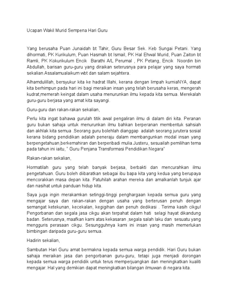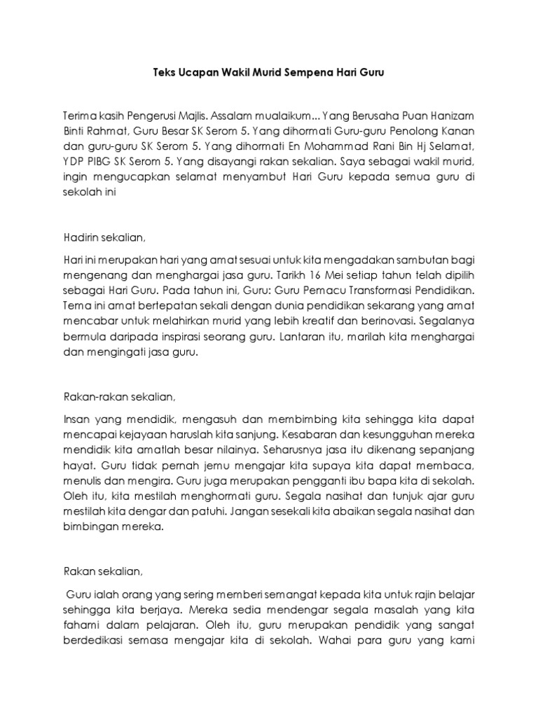 Teks Ucapan Ketua Murid Sempena Hari Guru Skbg 2015 2